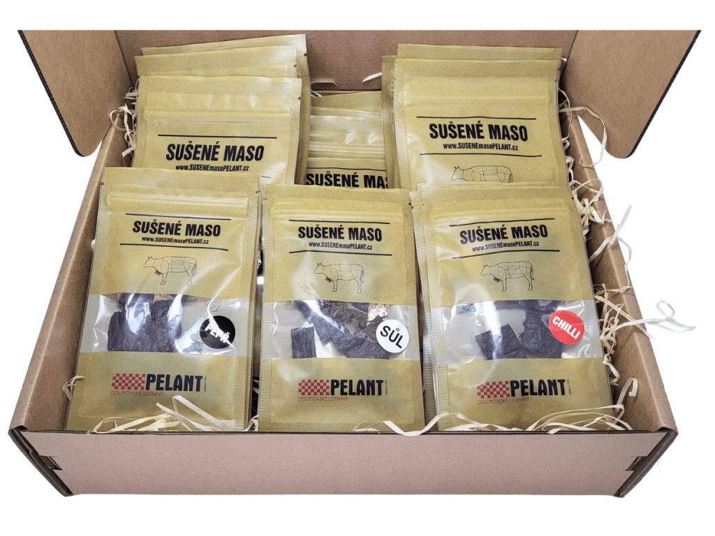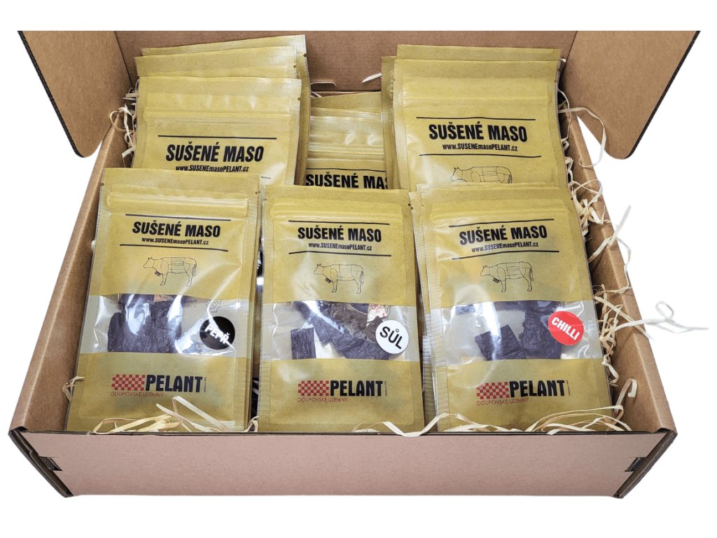 V dárkovém boxu je zabaleno 9 kusů 25g a 9 kusů 50g balíčků, tj. téměř 3/4 kg sušeného masa.#ShowMore#